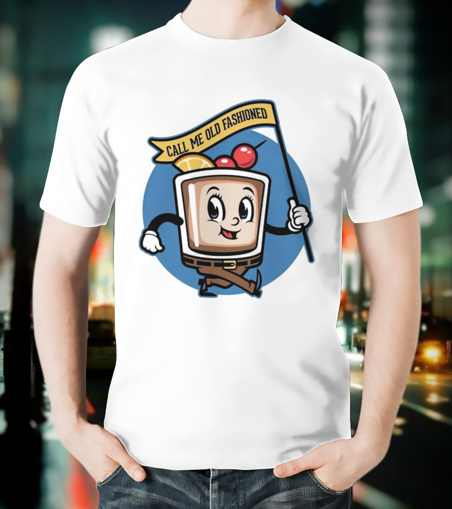 Whiskey Call Me Old Fashioned Cartoon Drink Character with Flag and Cherries T-Shirt made from pre-shrunk ring-spun cotton. This t-shirt is designed with attention to material and construction for everyday wear.