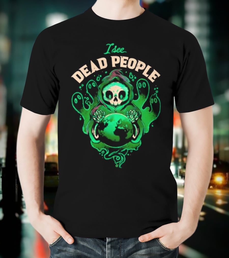 I See Dead People Grim Reaper Holding Earth with Ghosts T-Shirt made from pre-shrunk ring-spun cotton. This t-shirt is designed with attention to material and construction for everyday wear.