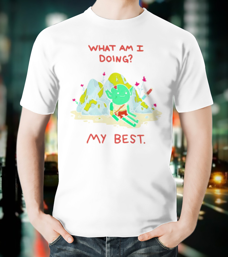 WHAT AM I DOING MY BEST Seated Goblin with Sword in Rocky Landscape T-Shirt made from pre-shrunk ring-spun cotton. This t-shirt is designed with attention to material and construction for everyday wear.