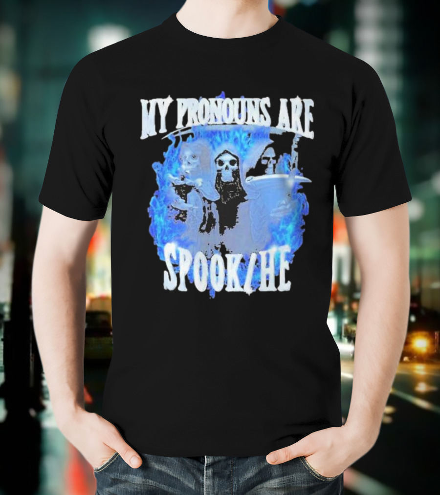 My Pronouns Are Spook He Blue Flames Grim Reaper Trio T-Shirt