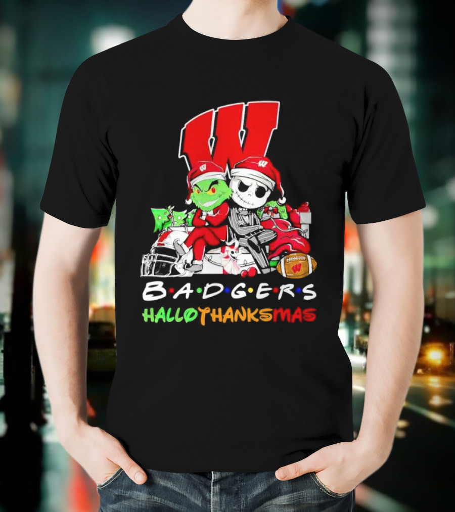 Badgers HalloThanksMas Grinch Jack Skellington Friends Football W T-Shirt