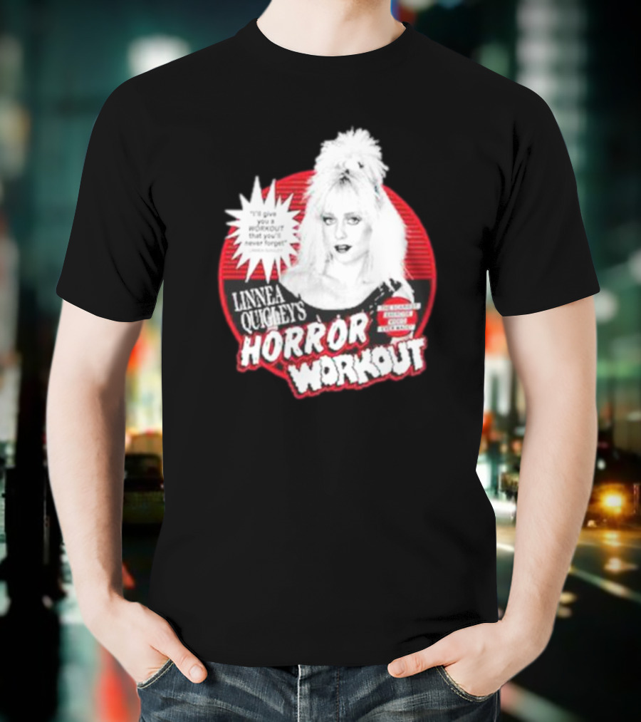 Linnea Quigley's Horror Workout Red Circle T-Shirt made from pre-shrunk ring-spun cotton. This t-shirt is designed with attention to material and construction for everyday wear.
