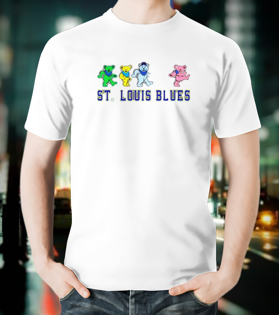 Grateful Dead St. Louis Blues Dancing Bears T-Shirt made from pre-shrunk ring-spun cotton. This t-shirt is designed with attention to material and construction for everyday wear.