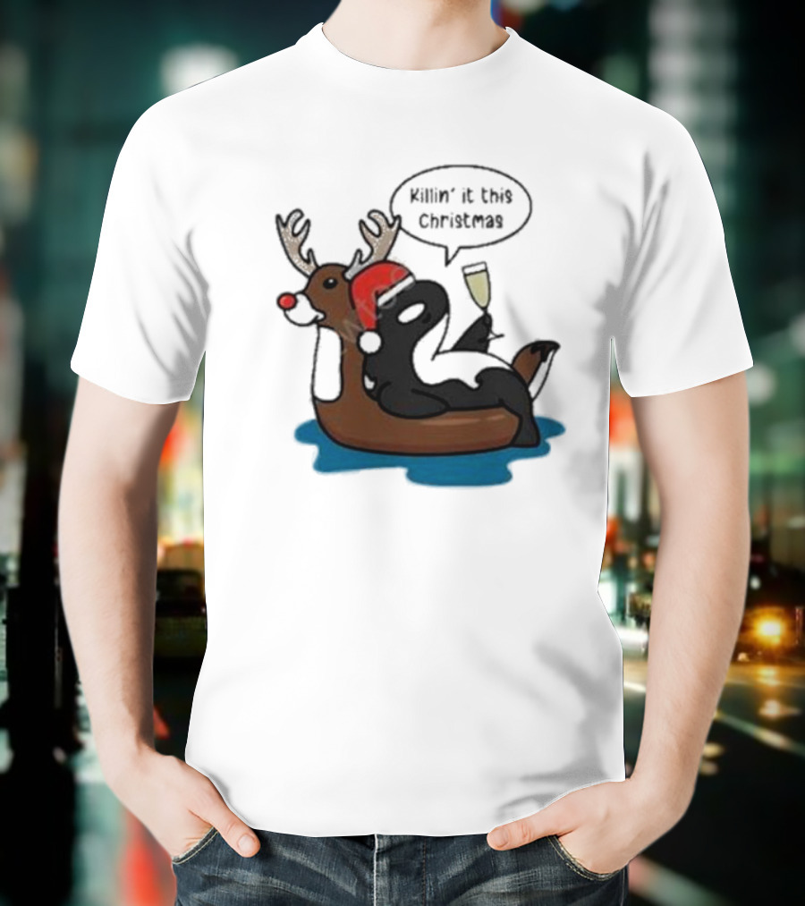 Killin' It This Christmas Dolphin Orca Reindeer T-Shirt made from pre-shrunk ring-spun cotton. This t-shirt is designed with attention to material and construction for everyday wear.