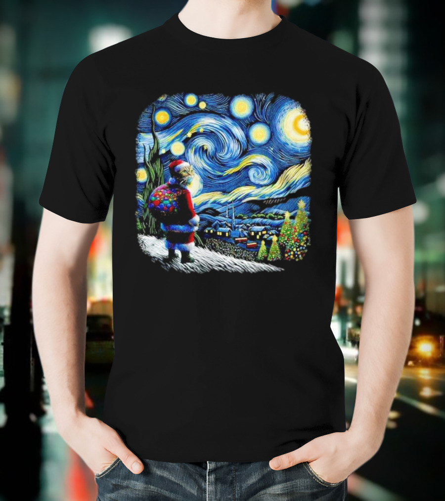 Cat Santa Paws Van Gogh Starry Night Christmas Holiday Scene T-Shirt