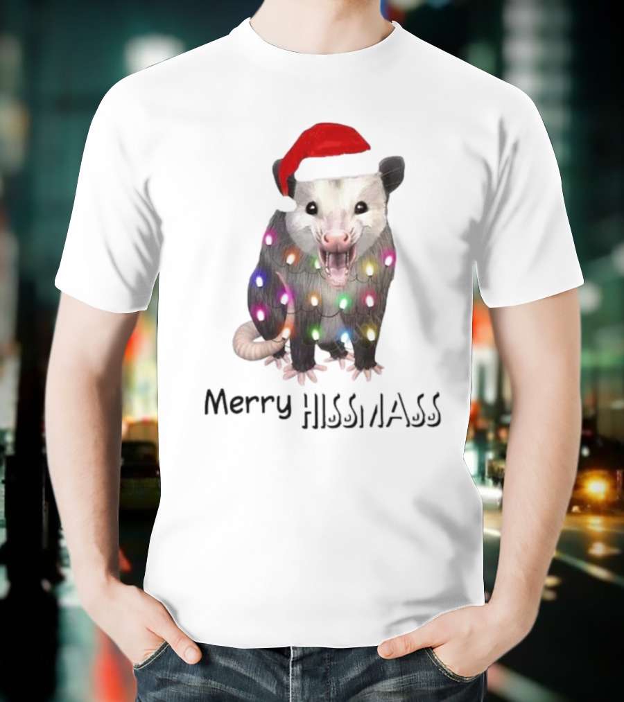 Merry Hissmas Opossum Santa Hat Christmas Lights T-Shirt made from pre-shrunk ring-spun cotton. This t-shirt is designed with attention to material and construction for everyday wear.