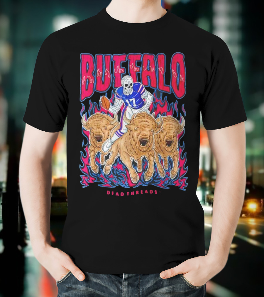 Buffalo Football Dead Threads Skeleton Quarterback Riding Buffalos T-Shirt made from pre-shrunk ring-spun cotton. This t-shirt is designed with attention to material and construction for everyday wear.