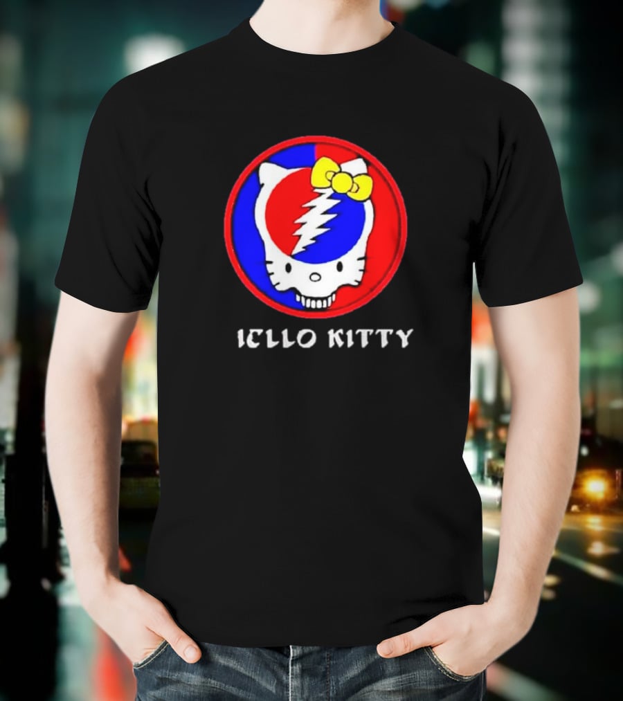 Hello Kitty Grateful Dead Skull Icon With Lightning Bolt And Yellow Bow T-Shirt
