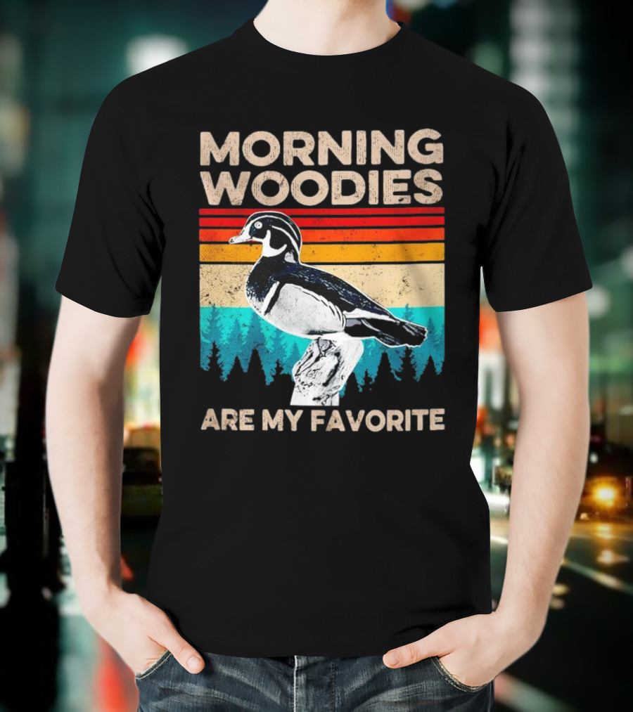 Morning Woodies Are My Favorite Vintage Duck Silhouette Retro Stripes Forest Pines T-Shirt made from pre-shrunk ring-spun cotton. This t-shirt is designed with attention to material and construction for everyday wear.
